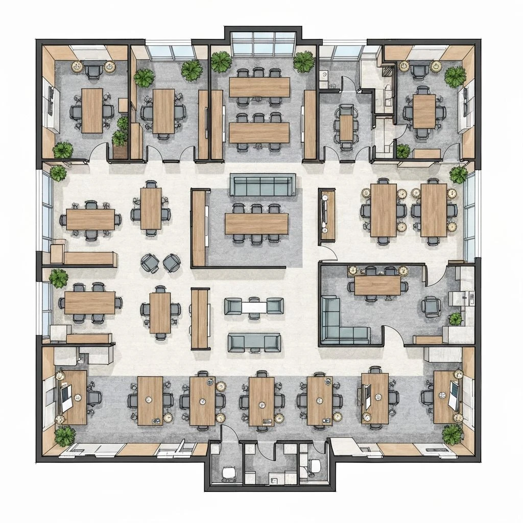 AIのサポートでカスタマイズ可能なオフィス間取りを作成。ワークスペースのレイアウト、協働エリア、生産性ゾーンを最適化して理想のオフィス環境を実現。